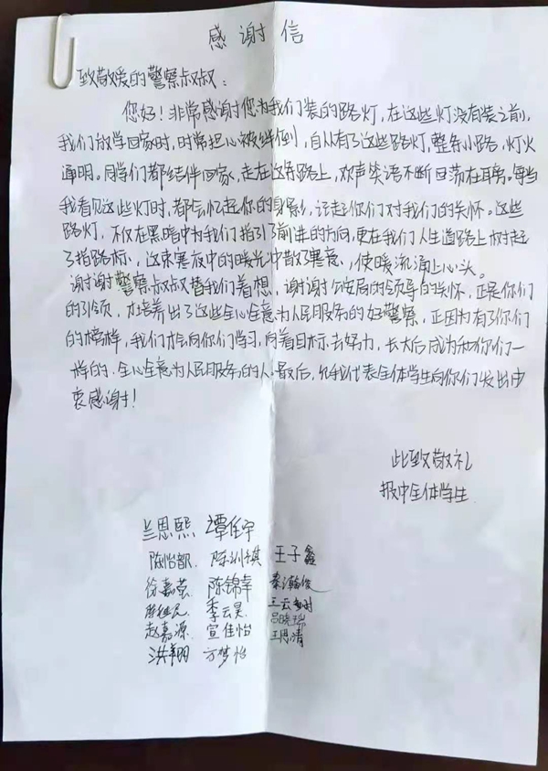 “非常感谢您为我们装的路灯,自从有了这些路灯,整条小路灯火通明同学们走在路上欢声笑语不断……”