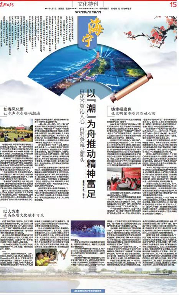 在这里,高品质文化服务体系呼之欲出,传统文化传承、文艺精品创作、文化产业发展等在文化大潮中逐浪而行,悄无声息地发生“嬗变”,2021年更是以市委1号文件形式下发了《推进文化复兴打造潮城海宁的实施意见》。