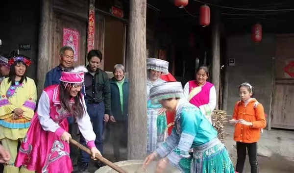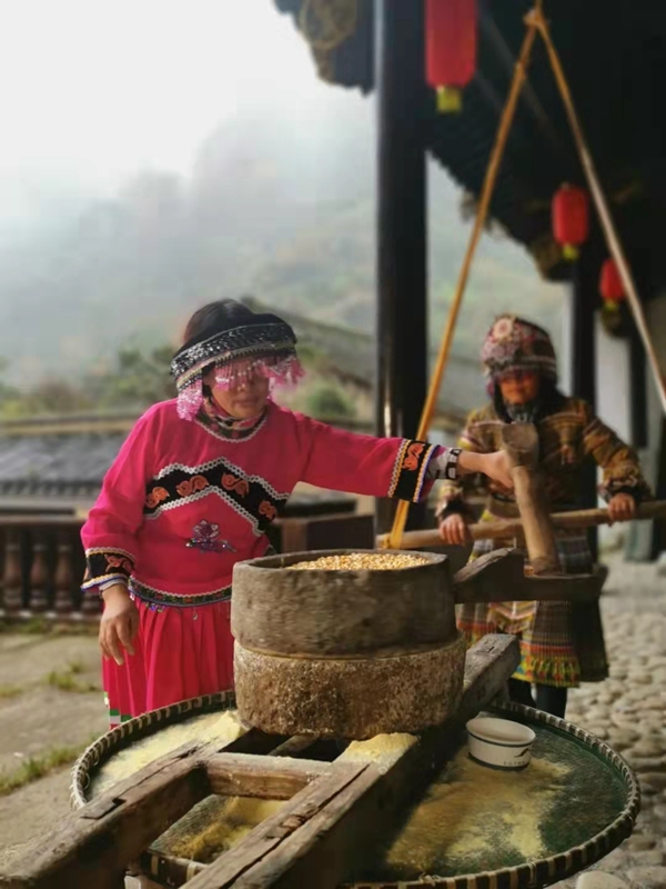 村民研磨黄豆粉,制作糍粑过新年。