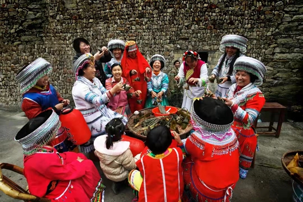 少数民族妇女围坐一起,包粽子,过新年。