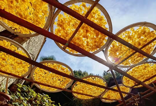 村民晒制当地特色小吃玉米饼。