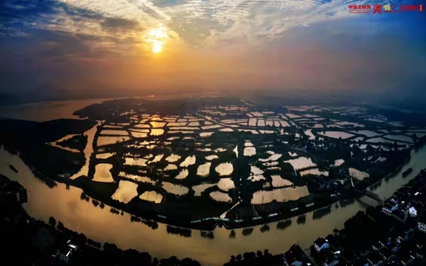 从高处俯瞰桑基鱼塘,万亩鱼塘水网交织。