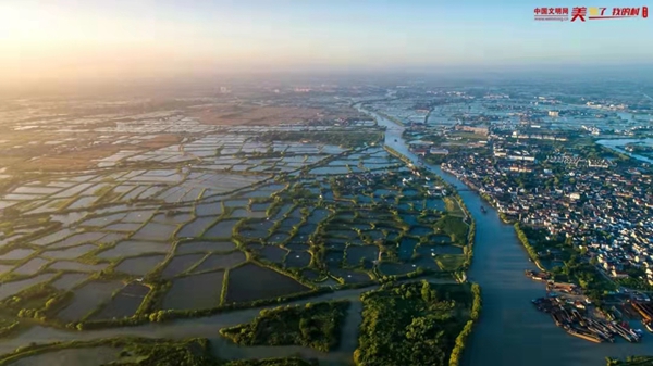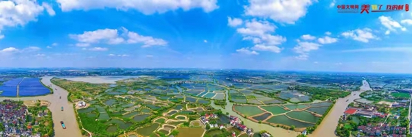 纵横交错的碧湖翠绿,一望无际的桑基鱼塘在阳光的映照下风光迷人。