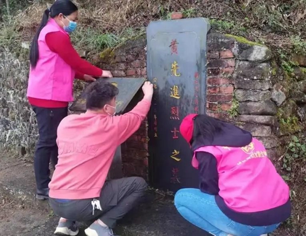 “这是我们夏黄村的烈士黄先进,我们每年都会来为烈士除尘扫墓。”在大畈乡夏黄村一名烈士墓前,几名志愿者正在清扫落叶、拔草、擦拭墓碑。其中一名志愿者陈小英为我们简单介绍了黄先进烈士的事迹:黄先进出生于1932年,1950年入伍,1954年在温州洞头县霓屿岛牺牲,时为中国人民解放军公安军第17师高机连文化教员。“我们还将为烈士纪念碑描红,清明节组织村党员干部前来祭扫、缅怀烈士。”