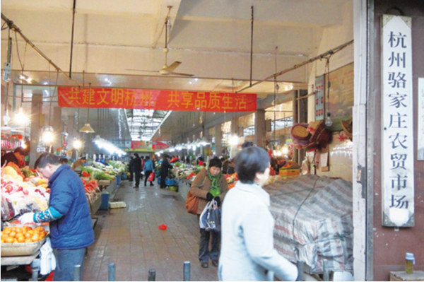 2015年以前的骆家庄农贸市场是一座棚式结构的简易农贸市场,几乎没有配套设施,环境脏乱差。随着杭州市文明城市创建工作的不断推进,同时也为满足周边居民对良好购物环境的需求,从2015年开始,骆家庄股份经济合作社先后投入2800万元对农贸市场进行了彻底改造提升。目前,农贸市场共分上下两层,不仅严格按照标准化要求设置购物摊位,而且还建立了统一的市场指导价格系统、消费者投诉系统、产品质量检疫检验系统,为消费者把好舌尖上的安全关。在硬件配置上,安装了扶手电梯、物价电子显示屏,设置服务台、检测室、公共卫生间等配套设施,努力为消费者和经营户营造一个温馨和舒适的消费和工作环境。