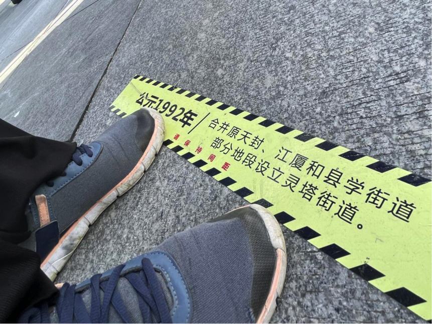 现场可以看到,13张明黄色的罗城千年地贴延续了近40米——公元695年-696年,建天封塔;公元1372年,知府张琪在原景福律寺重建“宁波府城隍庙”;公元2003年,灵塔街道更名为江厦街道……市民每前进一米就跟随着历史的长河跨越了百年。
