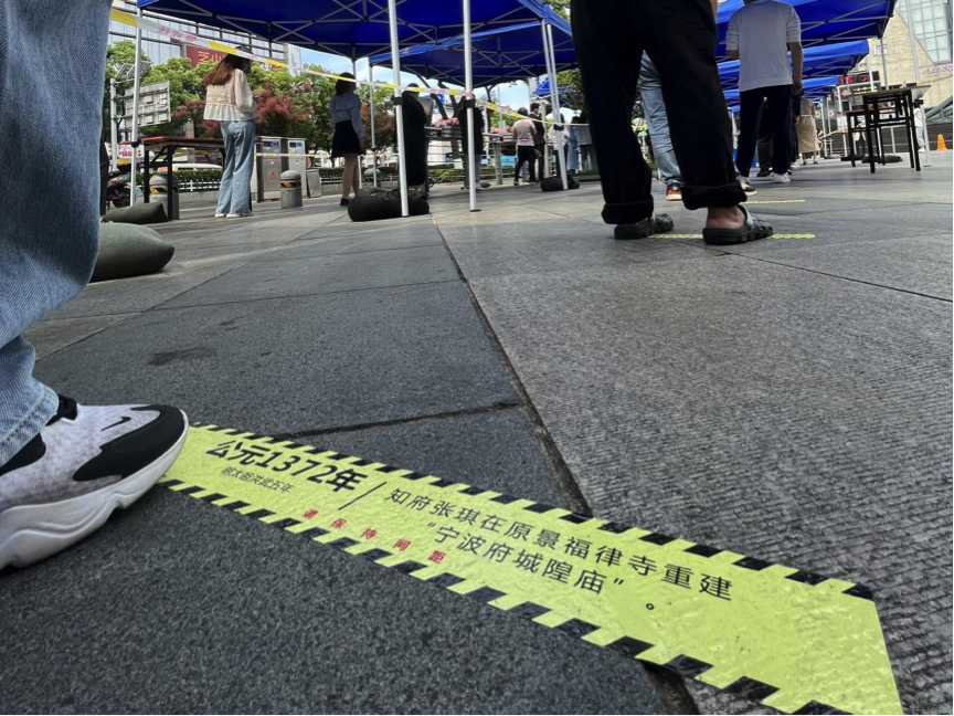“排队做核酸,站在一米线上,还能了解一段发生在脚下的历史,让排队不再无聊,也缓解了疫情下的焦虑情绪。”5月7日上午,在宁波海曙区江厦街道天一广场6号门的核酸采样点,等待采样的市民看着脚下“一米线”变身为极具文化韵味的罗城千年地贴,纷纷点赞。