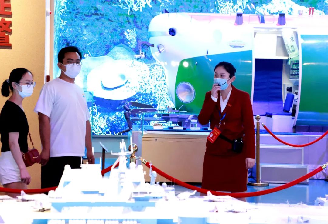 2022年7月3日,参观者在中国共产党历史展览馆内听讲解员介绍。新华社记者潘旭摄
