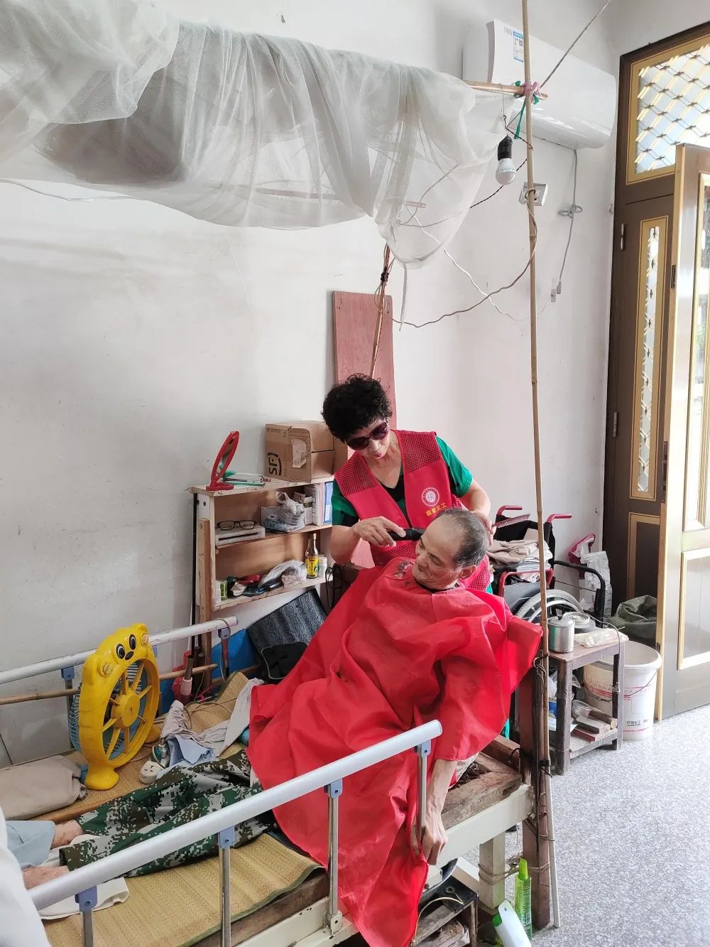 每隔1个月,每年6次,志愿者们就会上门送慰问,把老人家里打扫得干干净净,为老人理发,何建芳笑逐颜开。