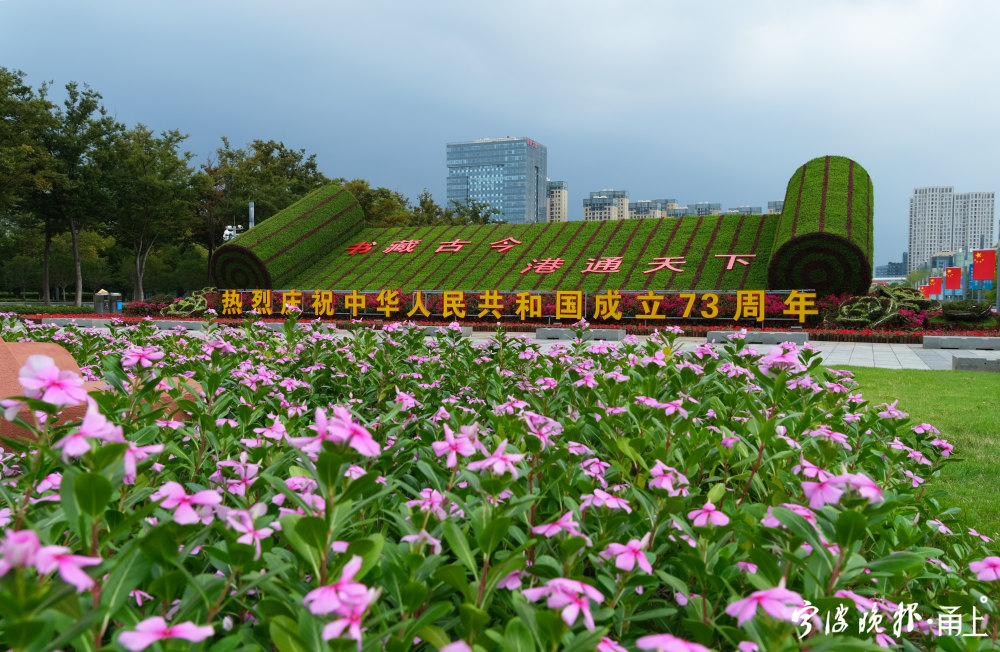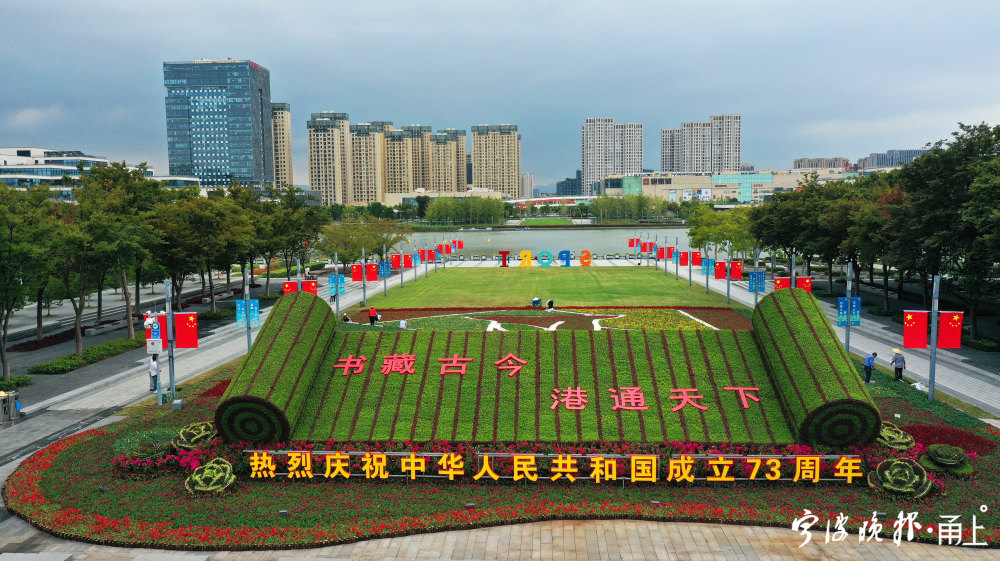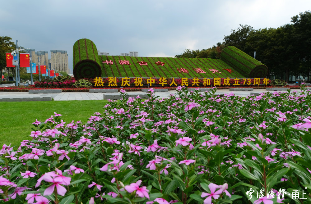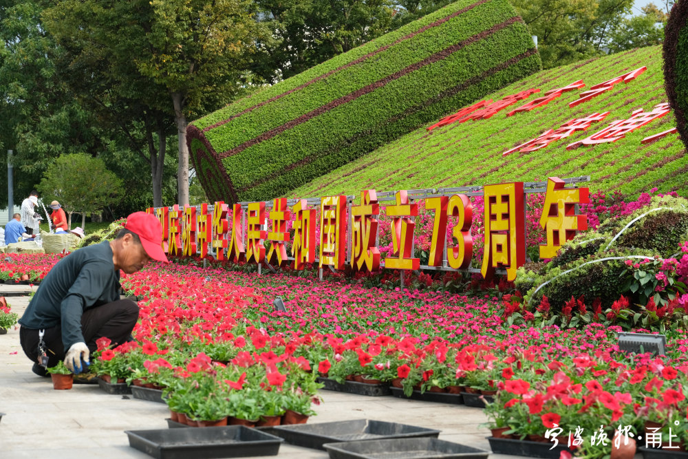 国庆临近,甬城街头的节日氛围渐浓。9月27日,记者在东部新城市民广场看到,园林工人正在摆设迎国庆花境。该花境以“书藏古今、港通天下”为主题,运用石竹、孔雀草、海棠、牵牛花、鸡冠花以及三角梅等共计13万盆花卉,打造出“书卷”“瓷瓶”等独特的宋韵文化符号,并通过多层次的造景和色彩搭配,烘托古今交融、盛世繁华的恢宏场景。
