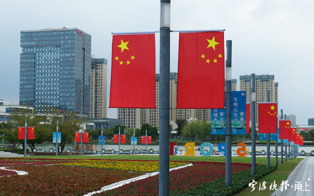 据鄞州区综合行政执法局工作人员介绍,今年国庆,该局分别在东部新城市民广场、金光中心前、鄞州公园二期北门、院士公园首南东路入口打造了4个各具特色的主题花境,并在通途路、民安路、百丈路等16条主干道路两侧灯杆悬挂3200余面五星红旗,为市民营造欢乐祥和的气氛。