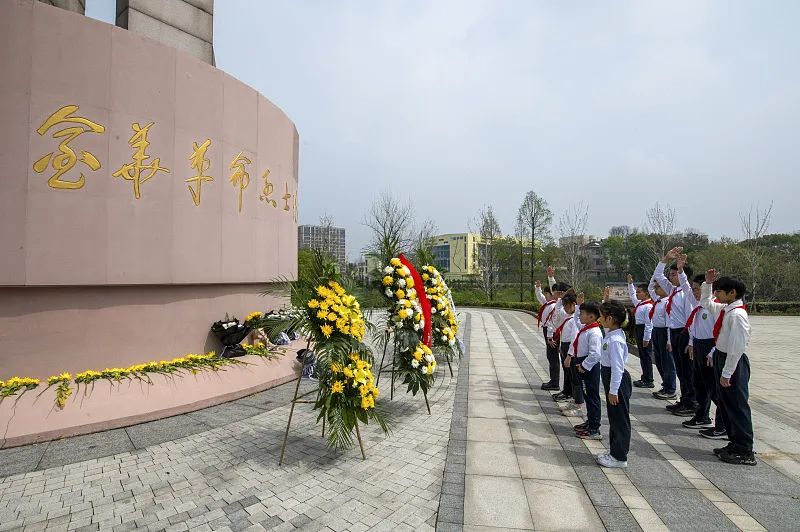 4月1日,浙江金华的革命烈士纪念碑前,少先队员在缅怀英烈图源:视觉中国