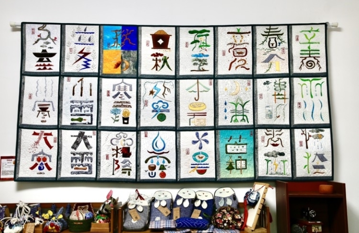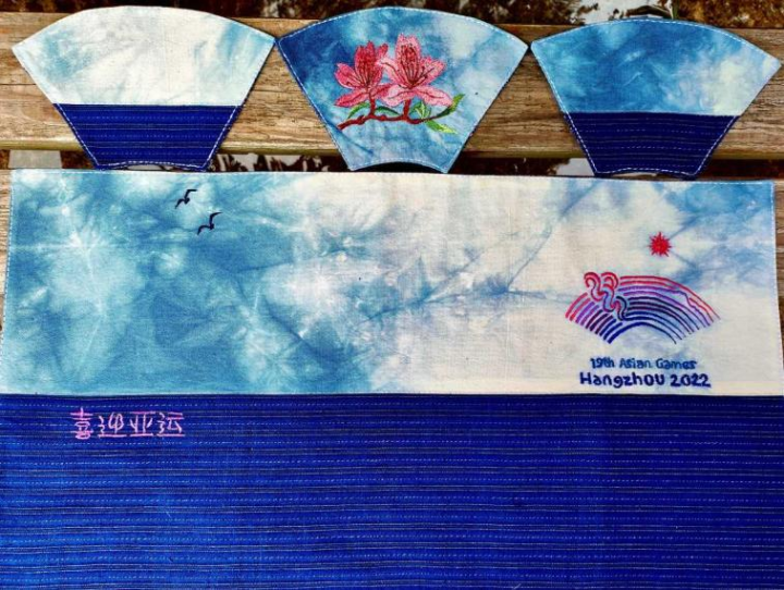 在傅春叶的工作室里,各种拼布和针线一应俱全,其中就有一幅名为“喜迎亚运——拼布蓝染扎染茶旗套装”的布艺作品。傅春叶介绍说,“杭州亚运会帆船帆板项目,将在阿拉宁波象山的亚帆中心举行,我很期待,也把相关内容设计到了作品里。”