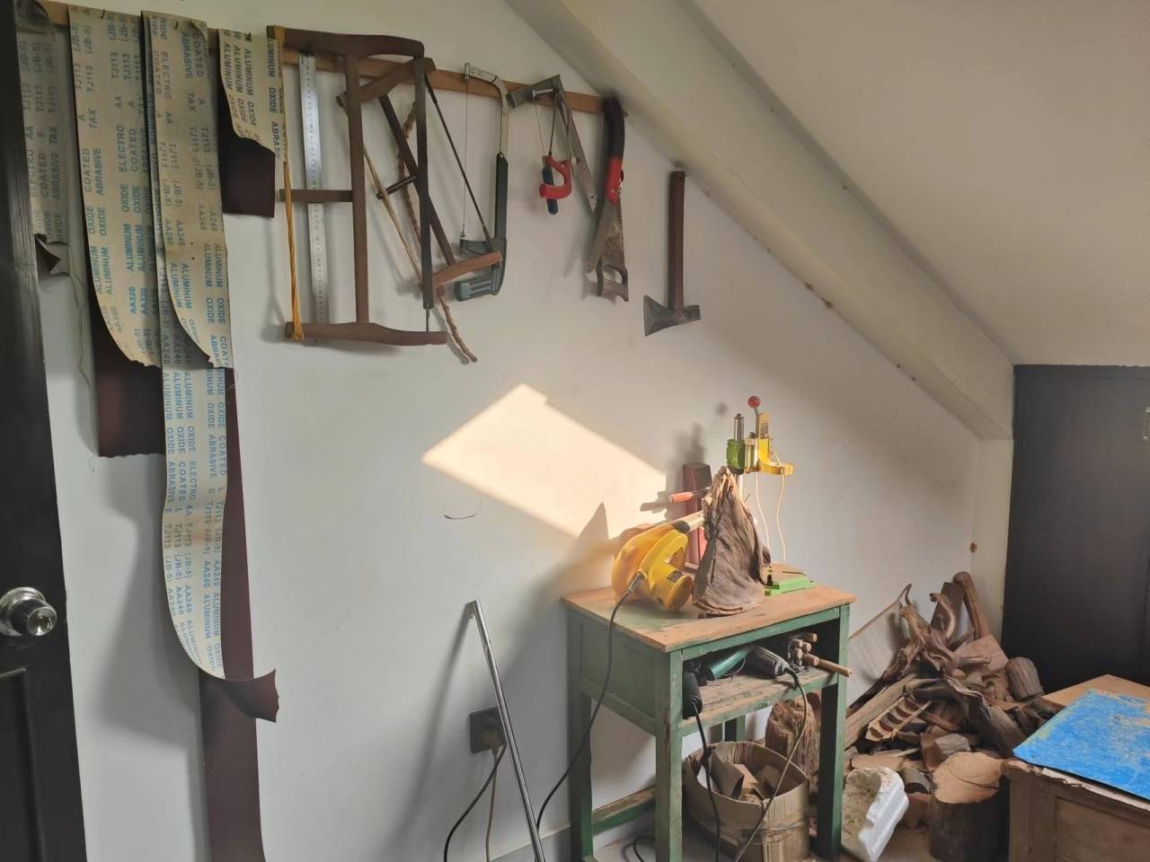 走进位于王店镇镇西村黄福根的家里,满满的都是根雕作品。别墅最顶层的小阁楼就是黄福根的雕刻工作室,在这里,各种雕刻工具应有尽有,有手动,也有电动的。还有不少雕刻用的枯木原料。黄福根正在创作他的新品——曝书亭。