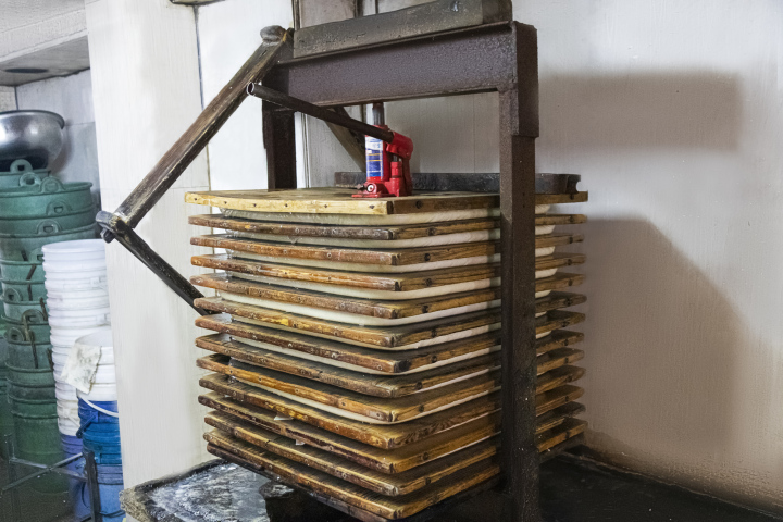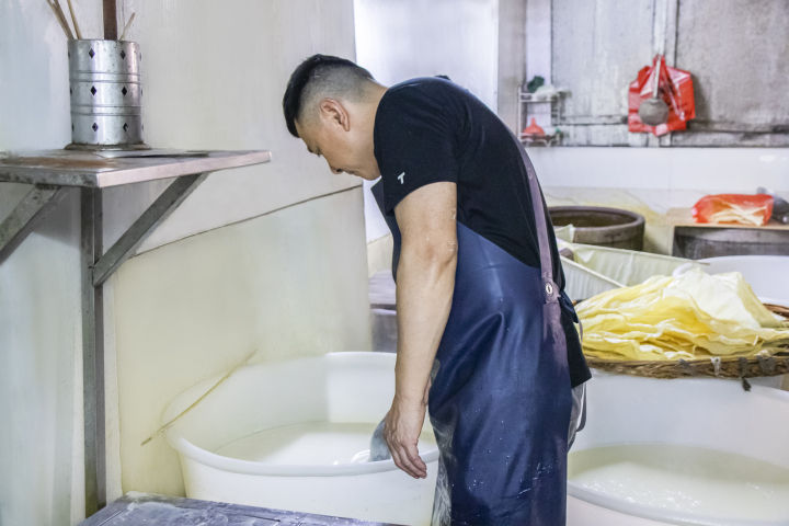 朱海峰是朱记豆腐干制作技艺第五代传承人,为了保持豆腐干的传统风味和口感,他坚持用好料、不掺假、延续传统手工制作。将一块块豆腐干制作得无比美味,背后是朱海峰一家五代人的坚持。在制作豆腐干的所有工序之前,首先要挑选出上好的原料——黄豆。每日深夜,朱海峰就要精选优质大豆,挑选出成色好的加清水浸泡,经过一夜,被清水唤醒的黄豆,体积膨胀,变得柔软饱满。清晨,朱海峰将泡涨的黄豆磨成汁香浆浓的豆浆,再倒入缸中用蒸汽煮沸,熬煮的火候和时间都很重要,不能煮过头,否则对点出的豆花多少、老嫩都有影响。煮开的豆浆里,还掺杂着许多豆渣,用白布过滤后,将豆浆稍稍冷却,再慢慢加入卤水,这一步至关重要,和传统的豆腐干不同,朱记豆腐干采用的纯卤水点卤,点出的豆花更加细嫩,豆腐干的植物蛋白更加均匀绵密。点好的豆花,慢慢倒入木质框里,一层层平整的叠好。为了将豆花中的水份尽量挤压出来,保证豆干Q弹有嚼劲,需要十分大的力气,朱海峰有自己的诀窍,他放弃用石块的传统方法,采用千斤顶压制豆腐干,省了很多功夫。压好的豆腐干按格子用刀切开、晾干,接下来就是最关键的一步:卤制。卤汁是朱海峰的秘密武器,十多种天然调料熬制的卤汁,鲜香扑鼻。卤制好的豆腐干将各种调料的滋味都吸收进去,呈棕红色。这一过程耗时耗力,但朱海峰始终坚持不偷工、不减料,也正是因为如此,朱家的手艺也一直为街坊邻里称道。