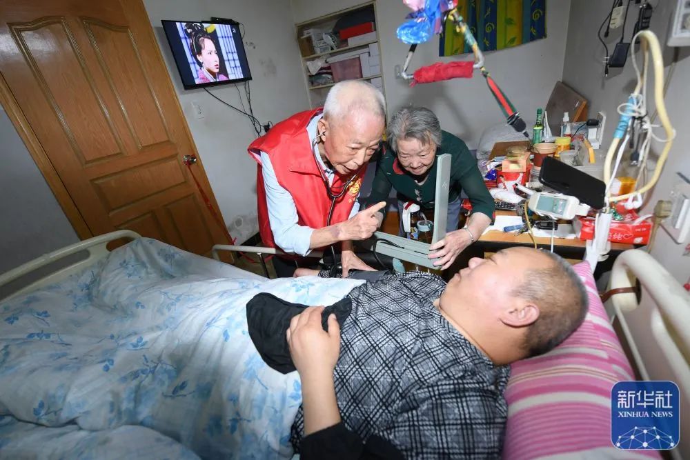 5月29日,在湖州市环渚街道玉堂桥社区,凌法林(左)上门走访一位瘫痪在床的残障人士,为他做基本医疗检查。