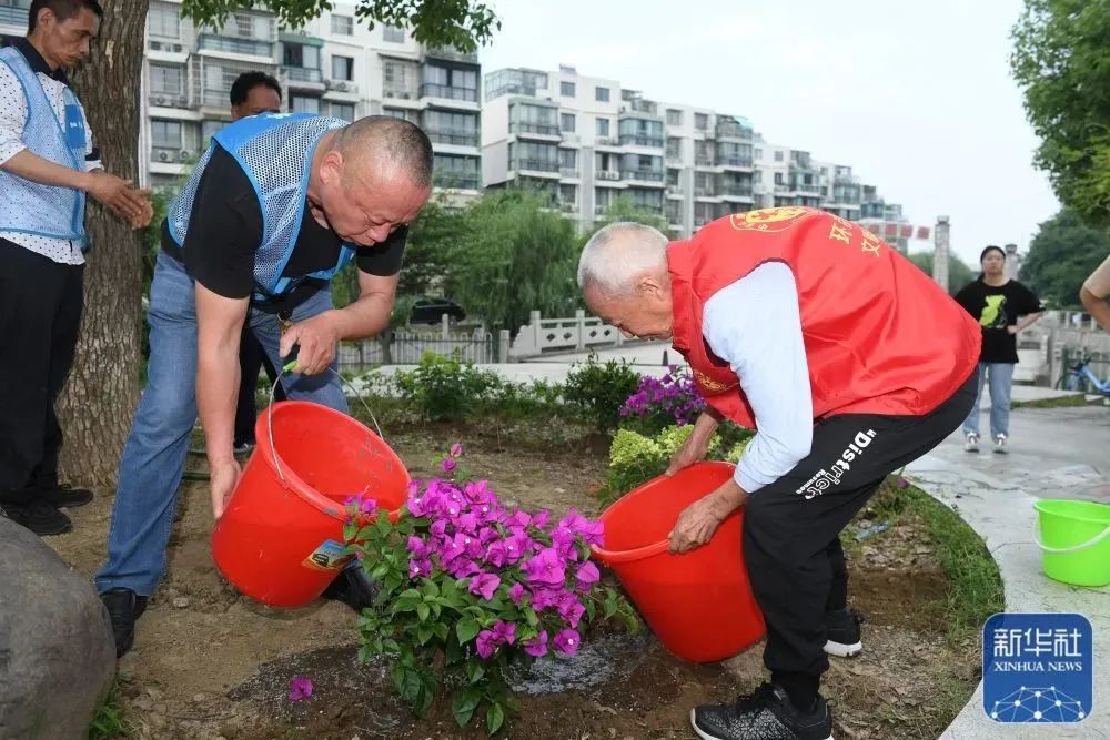 5月29日,在湖州市环渚街道玉堂桥社区,凌法林(右)带领残障人士在社区内种花。