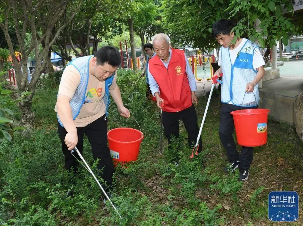 5月29日,在湖州市环渚街道玉堂桥社区,凌法林(中)带领残障人士参与到社区日常保洁工作中。