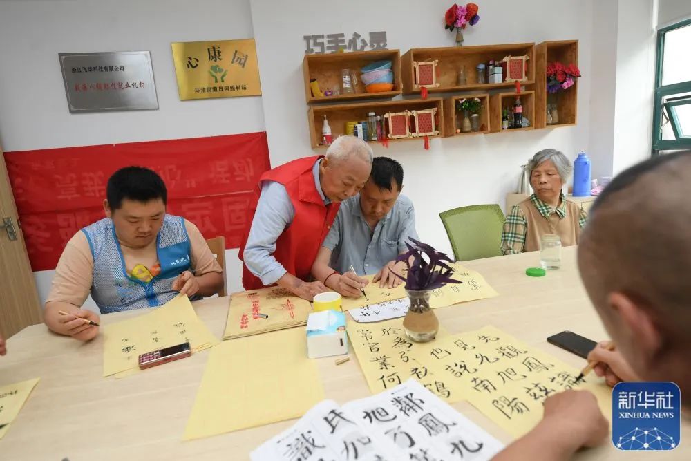 5月29日,在湖州市环渚街道玉堂桥社区,凌法林(左二)指导残障人士练习书法。