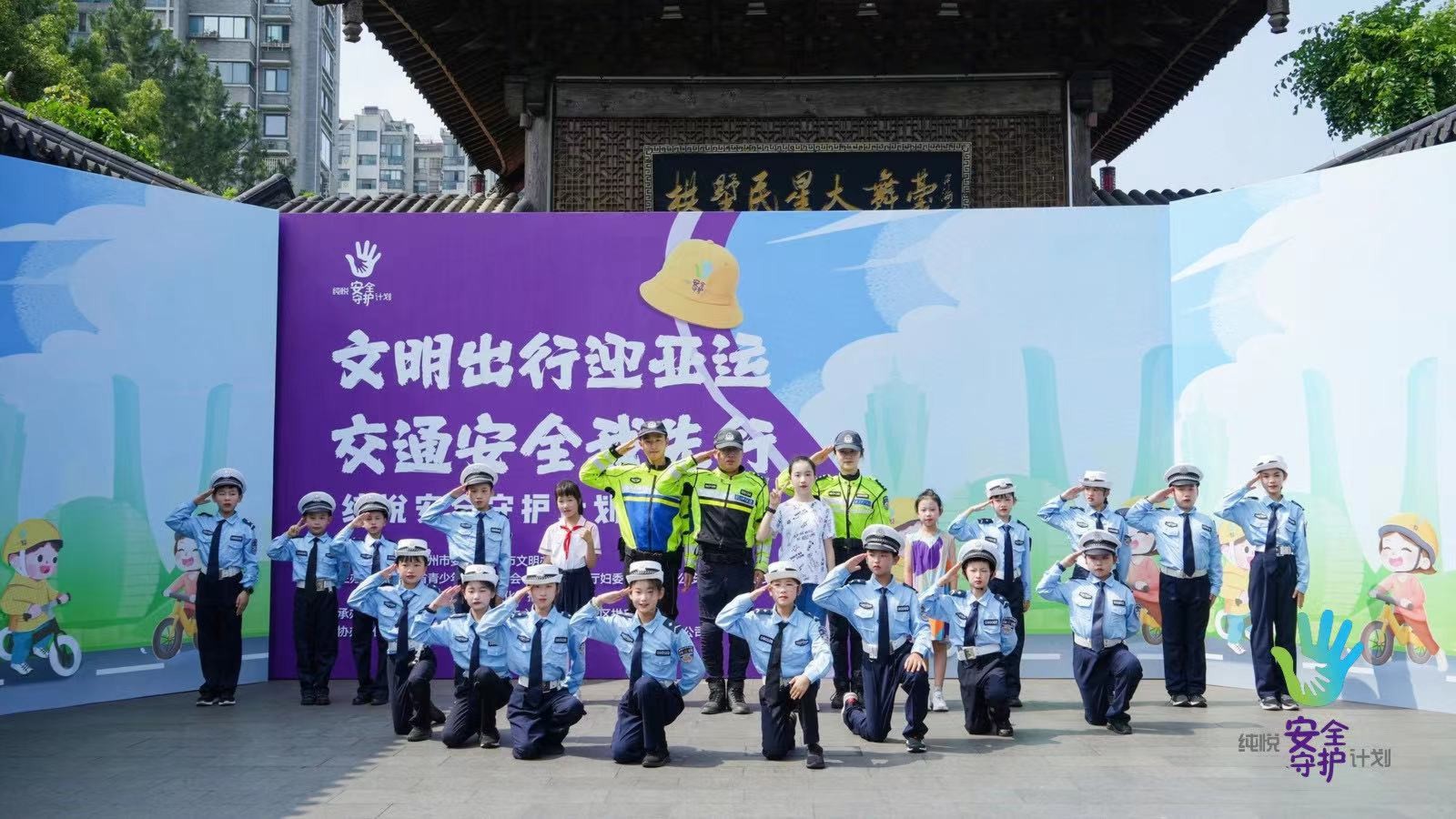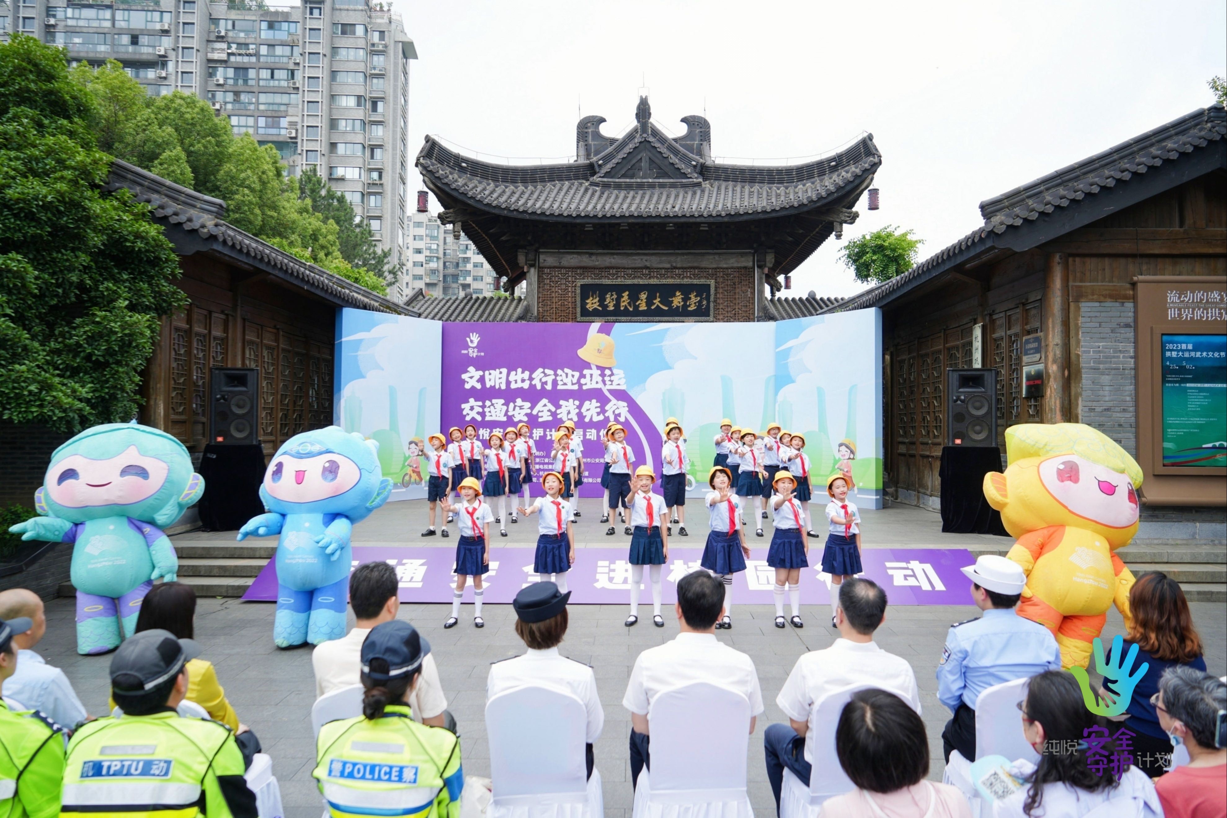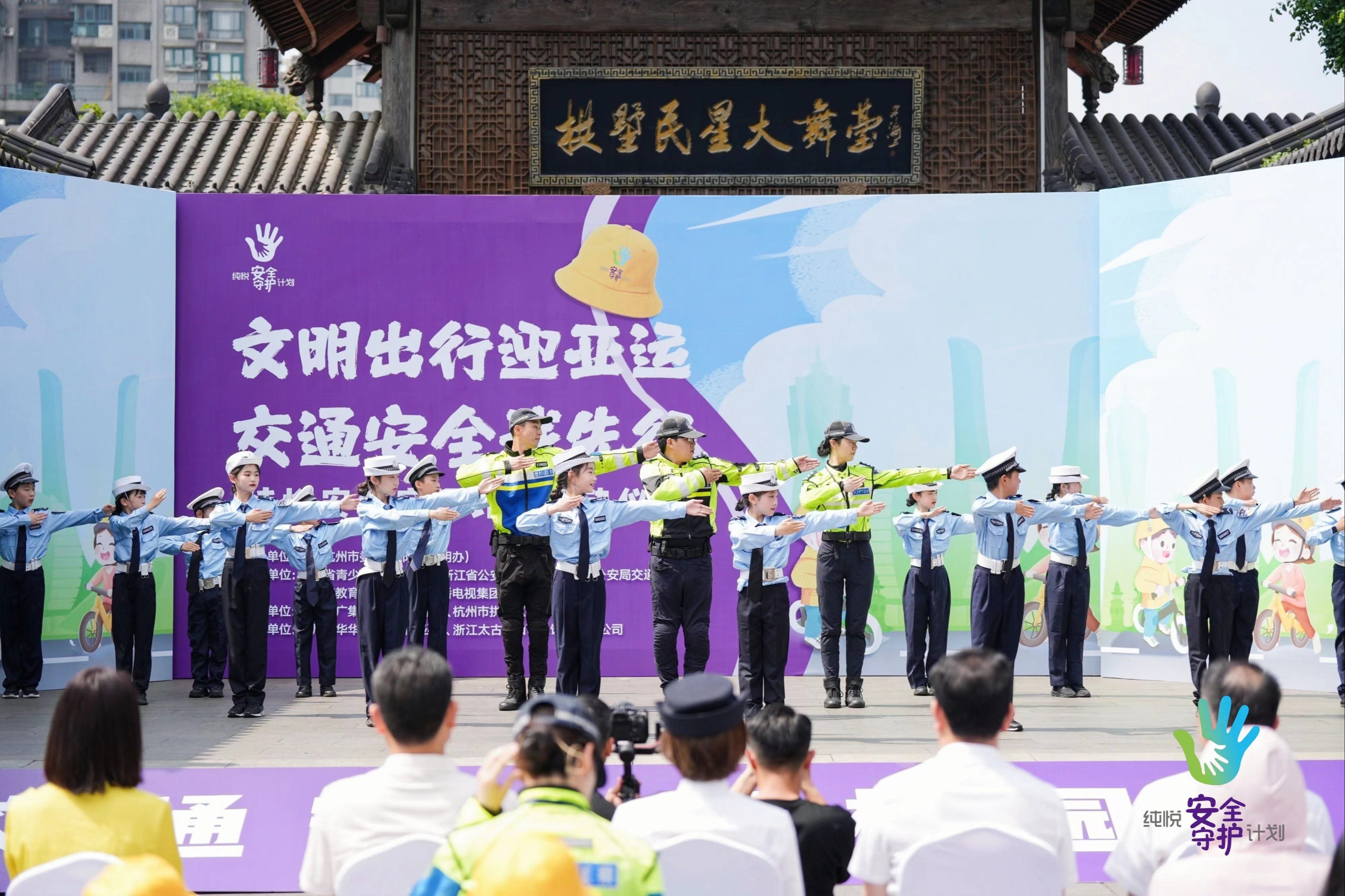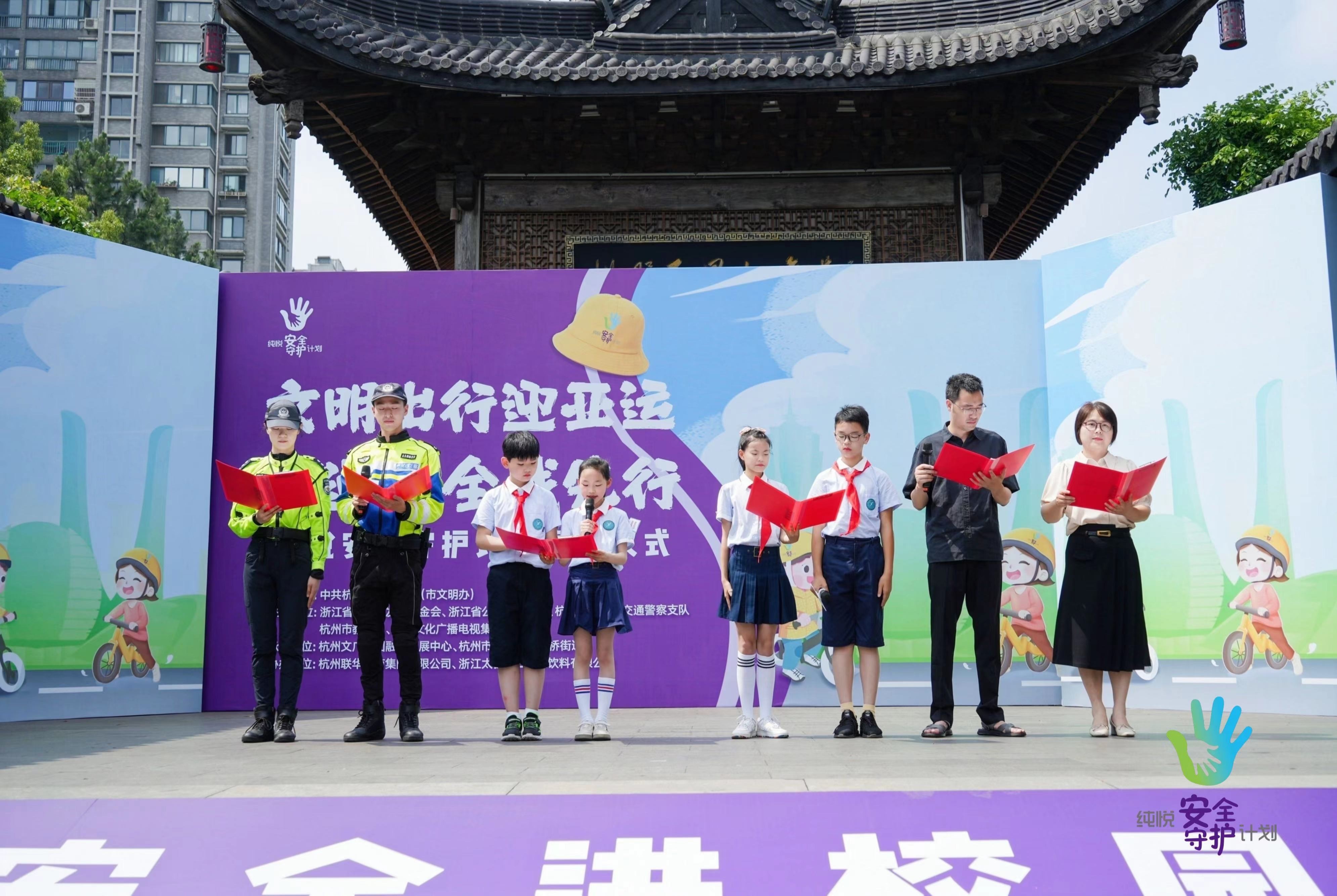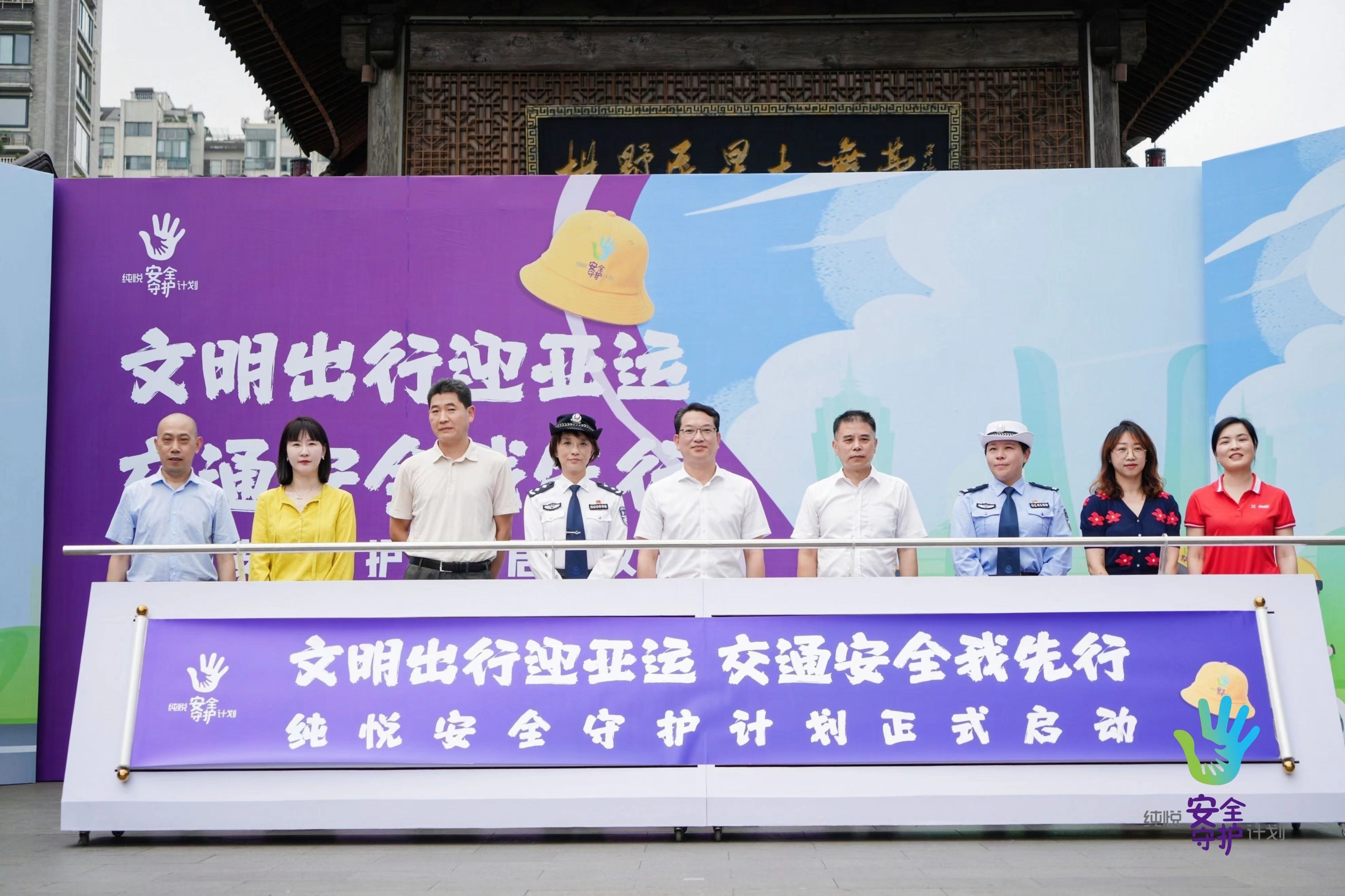 6月1日上午,交通安全第一课——“文明出行迎亚运交通安全我先行”纯悦安全守护计划在杭州拱墅运河广场正式启动。