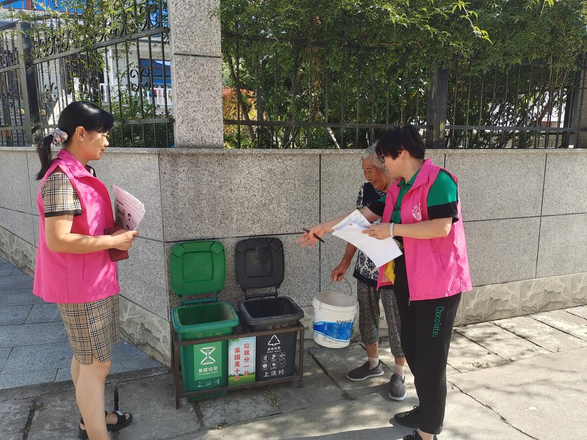 在志愿服务专岗中,杭州市二星级分类达人朱建英尤为积极,她每天上午9点到11点准时到岗,从垃圾围城的危害到垃圾分类的迫切性,从垃圾四分类的知识到生活中垃圾分类的技巧,并耐心的讲解分好类的垃圾的去处和处理方式,为群众解惑,对群众“晓之以理”。讲述从开展垃圾分类以来,上沃村村容村貌发生的改变、整体环境的提升以及平时生活体验的改善,对群众“动之以情”。加深群众垃圾分类的意识,提高群众参与垃圾分类的意愿和正确投分类投放垃圾的能力。
