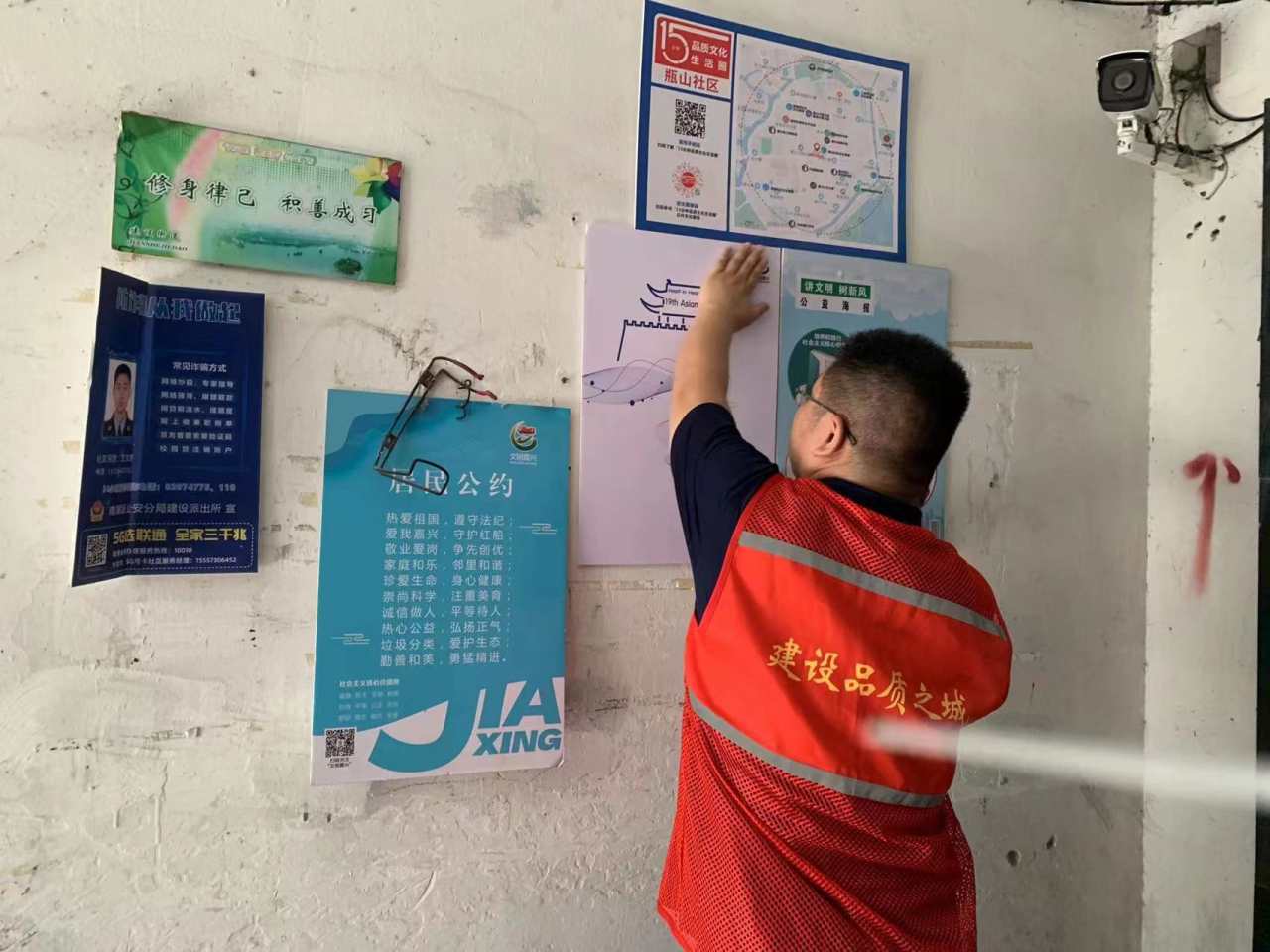 近日,建设街道瓶山社区、百福弄社区新时代文明实践站开展“携手迎亚运文明树新风”活动。炎炎夏日,挡不住党员志愿者、社区志愿者、大学生志愿者们的脚步。他们穿梭于居民小区、背街小巷……将迎亚运、文明宣传的海报张贴在显著位置,并倡导市民文明有礼,争做形象大使;率先垂范,争做文明标兵;亲切友善,争做城市主人,使文明的“淡妆”与城市的“盛装”相映相宜,将嘉兴文明形象传递至全世界。接下来,瓶山社区、百福弄社区新时代文明实践站将持续深入开展“迎亚运”城市文明大提升行动,为杭州亚运会的胜利举办凝聚坚强思想共识和磅礴精神力量,全力保障护航亚运。