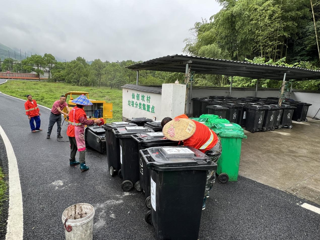 仙佰坑村每家每户门口都设有双色垃圾桶,并配备固定用的垃圾筐,方便居民分类投放生活垃圾。每日垃圾清运车会定时定点上门收集垃圾,再运送到村里的垃圾集置点。这种“一把扫帚扫到底”的管理模式,让乡村环境不再“多头管”,也让村民享受到更优质更专业的服务。