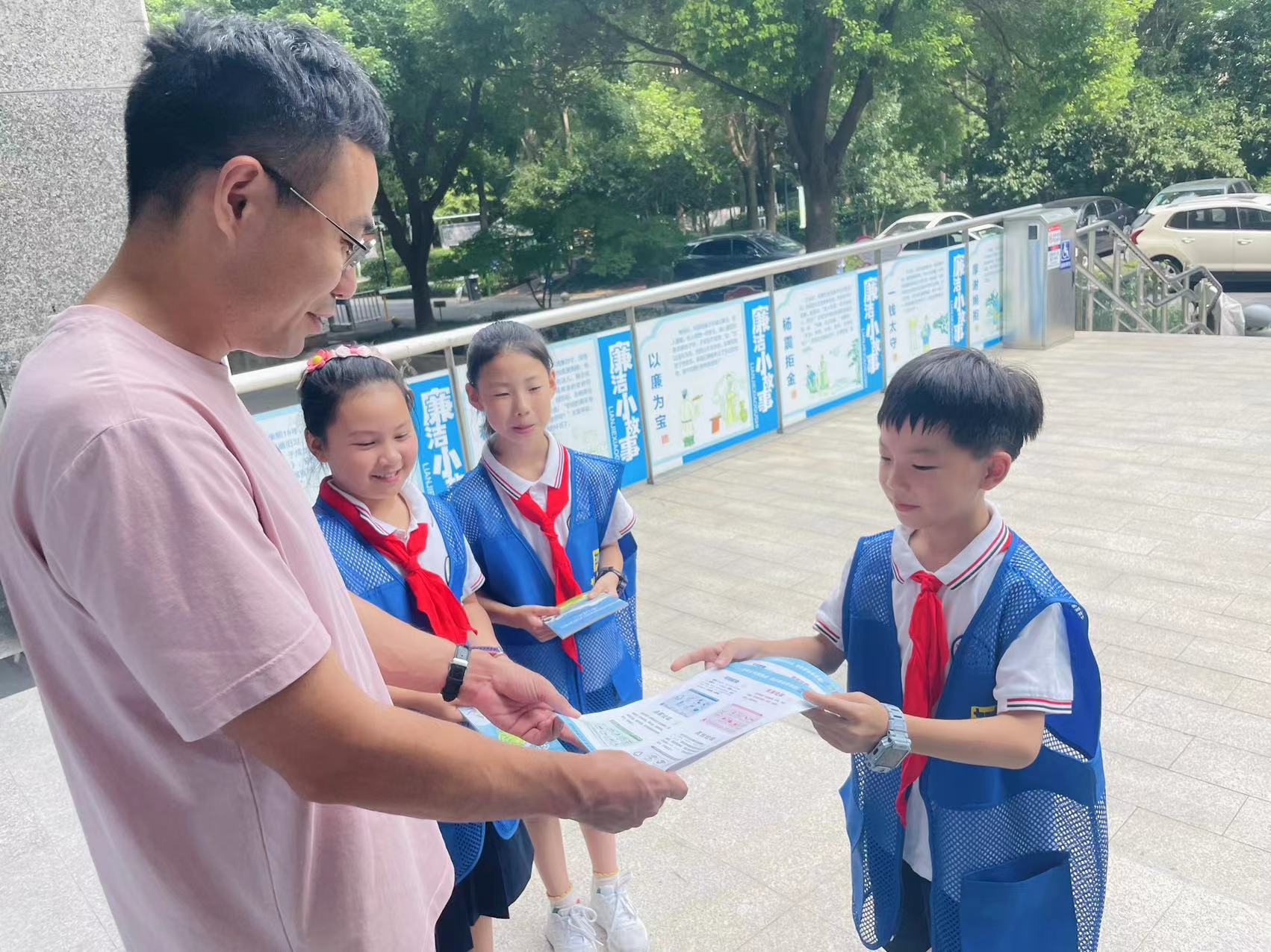 “叔叔,您好!我是垃圾分类小小宣传员,请问您今天垃圾分类了吗?”杭州市钱江湾小学202班扬帆中队肖义岑同学拿着宣传册,看着被他“逮到”的叔叔。
