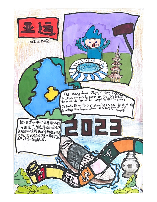 在此次活动前,杭州上海世外学校2A班的同学们利用课间时间,做了大量且丰富的前期准备工作。大家三五个聚在一起,你负责查找资料、我负责设计图案、他负责创作文案......前期创作过程开展得热火朝天。孩子们一边收集资料,一边进一步了解杭州亚运背后的故事,细数亚运举行日期,讨论新增加项目等等。