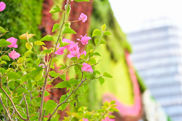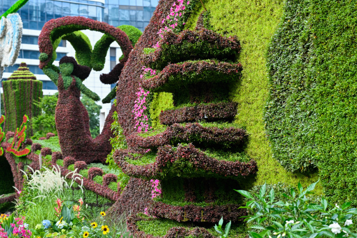 据了解,整个立体花坛共使用了近60种花卉,包括红草、绿草、佛甲草、景天、鹿蕊、三角梅、秋荷、向日葵、月季、滴水观音、茉莉花等等,“从构思到落地,一共用了15天,后续每天我们也会安排工作人员进行保湿修剪作业,并其实替换生长不好的植物,保证整个亚运期间都是最美的状态。”