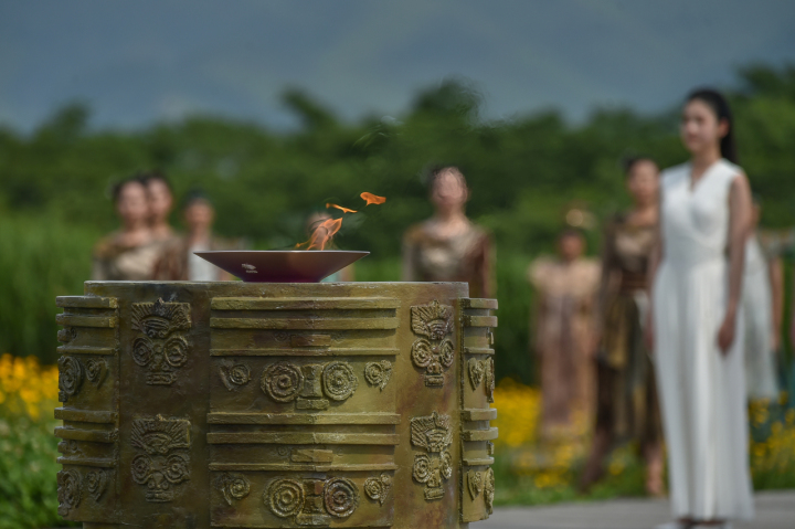 火种高举,乐声悠扬。五千年前,充满智慧的良渚先民在此敲出火花;如今在古老高台之上,亚运火种在此点燃。