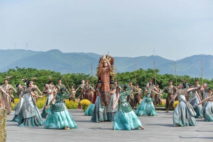 悠扬而神秘的音乐旋律下,身着远古服饰的良渚先民们,缓缓向大莫角山高地汇聚、起舞。演职人员们踩着鼓点摇动簸箕,将秧苗整齐插入脚下的土地,还原古人耕作的场景。良田万顷,风吹稻浪,先民挥动石镰的丰收场景如在眼前。