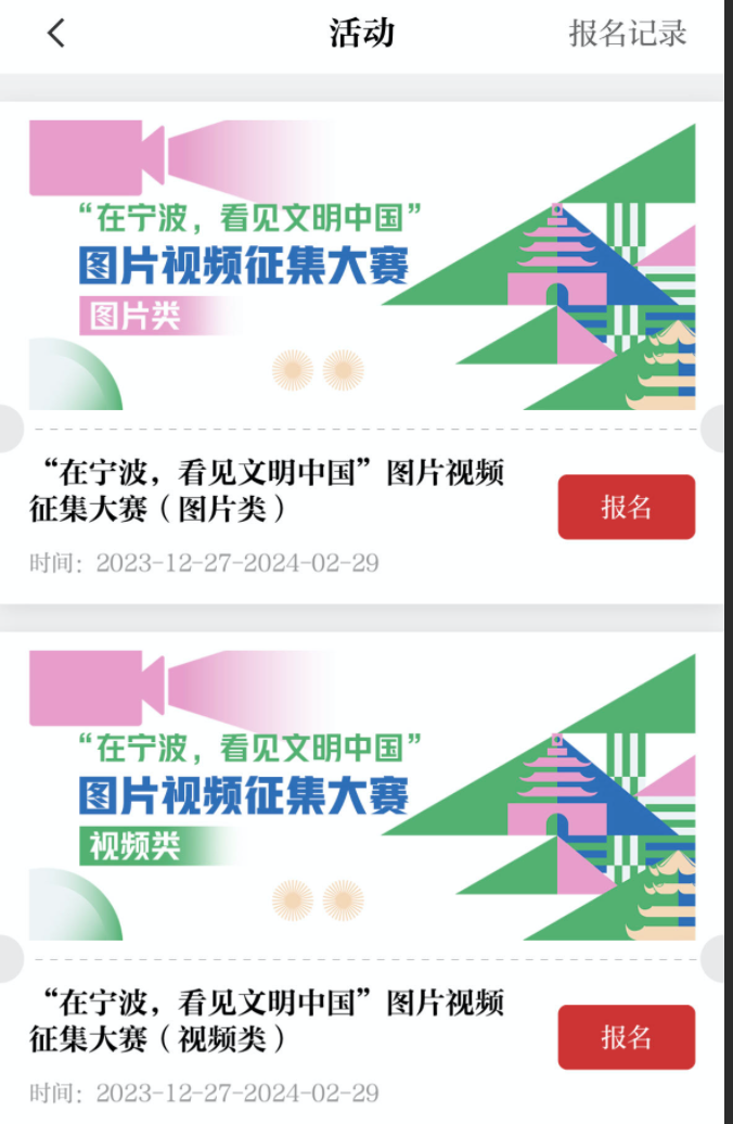 甬派客户端为本次大赛唯一报名平台,可点击底部“服务”栏,进入页面后,点进“最新活动”栏,即可看到“在宁波,看见文明中国”图片视频征集大赛报名入口。