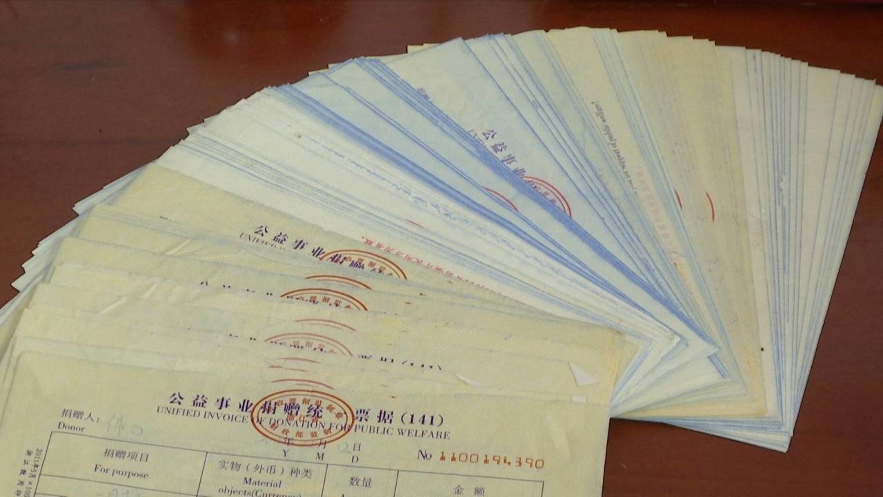在平湖市兴平颐养园,记者见到了金明洹老人,这张桌子的的小小抽屉里,储存的都是他最为珍视的东西。其中,有一沓厚厚的捐款单,130多张单据中,第一张已经泛黄,上面的时间是2011年12月,捐赠人的名字,叫做“佛心”。