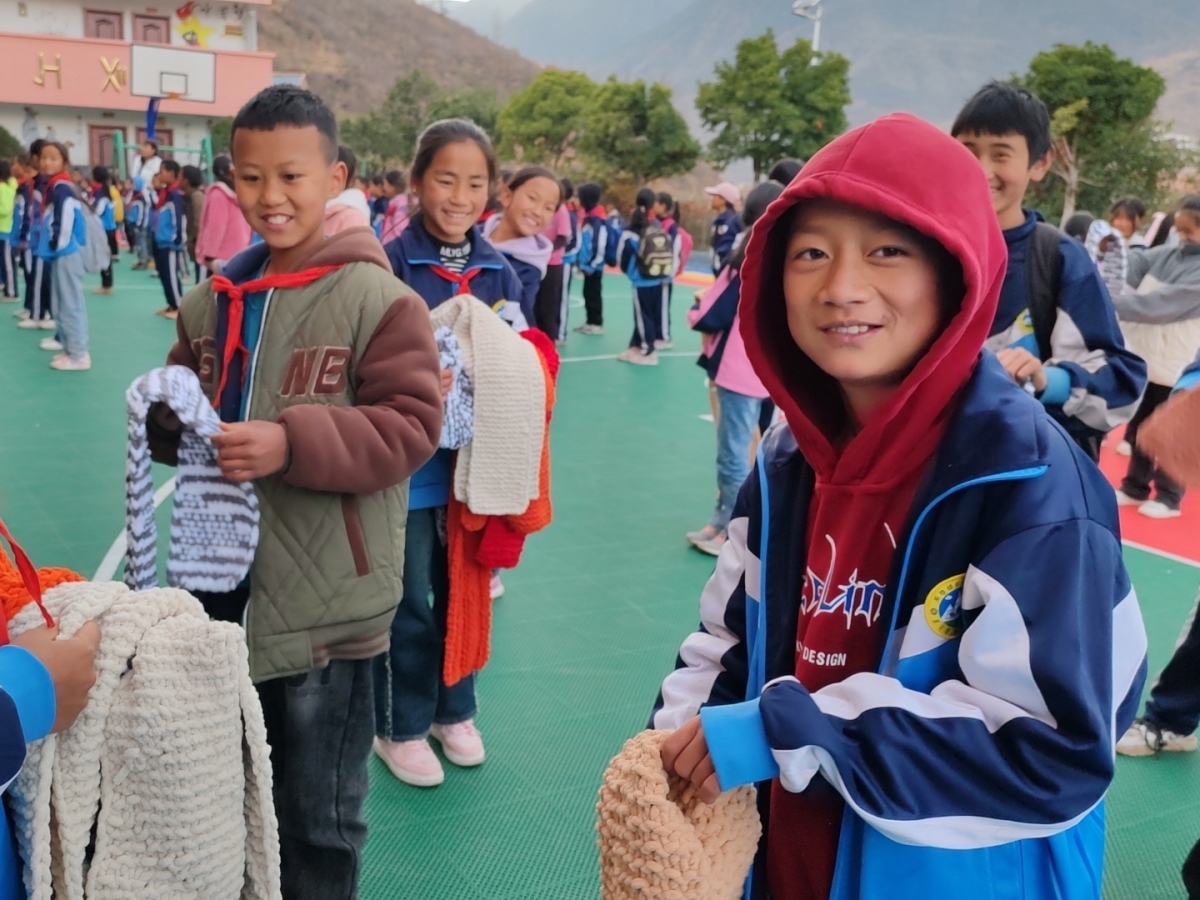 “感谢宁海的叔叔、阿姨们给我们送来的温暖围巾……”1月9日,迎着初冬的暖阳,四川省凉山彝族自治州普格县的孩子们收到了四个来自远方的“新年礼包”,500多条五颜六色的围巾,让普格的同学们在寒冬中感受到了温暖。在这段来自千里之外的视频中,孩子们裹着围巾,对着镜头露出了幸福的微笑。这一条条柔软的围巾并不是来自生产线,而是来自宁海县跃龙街道车河社区美丽工坊“巧娘”们的一针一线。为西部山区的孩子们编织爱心围巾,这件事车河社区已经坚持了六年。今年送到普格的500多条围巾,是社区120多名巧娘在10多天内完成的。