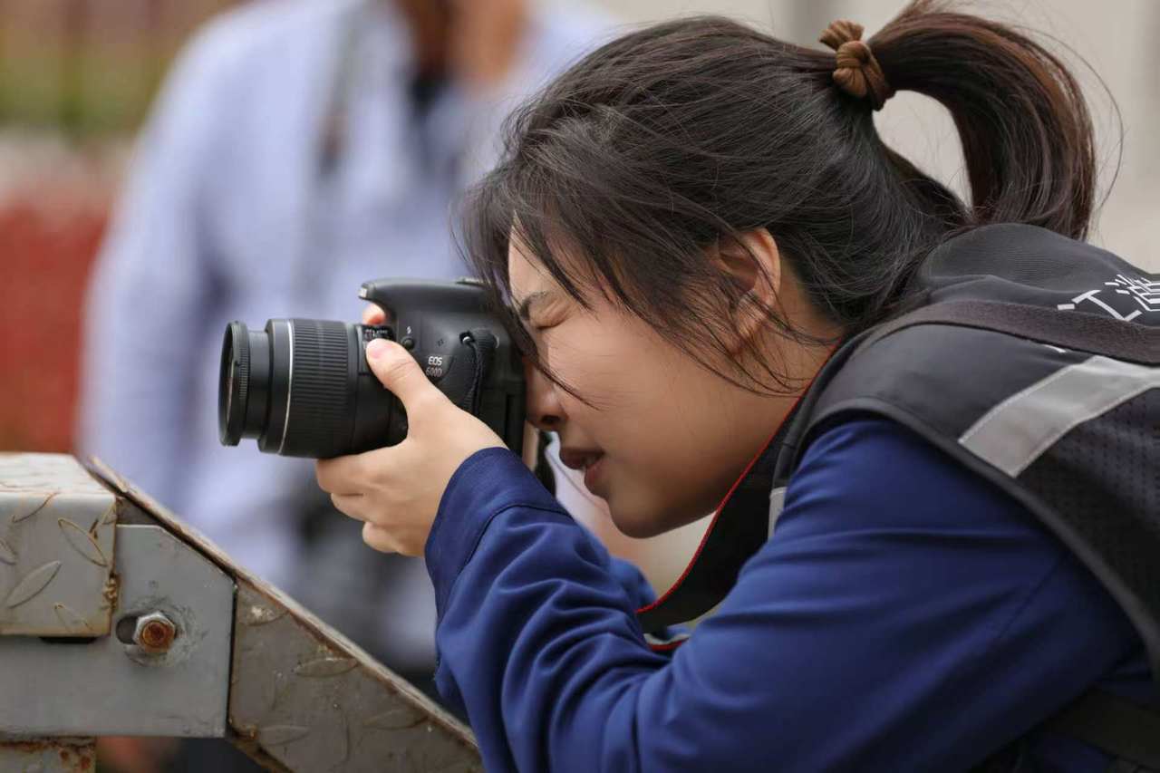 作为消防宣传员的严惠英,正在拍摄消防员比武。受访者供图