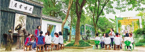 绍兴鲁迅小学开发《感受鲁迅》等系列校本阅读材料,并在仿制的“三味书屋”前开展阅读活动。受访者供图