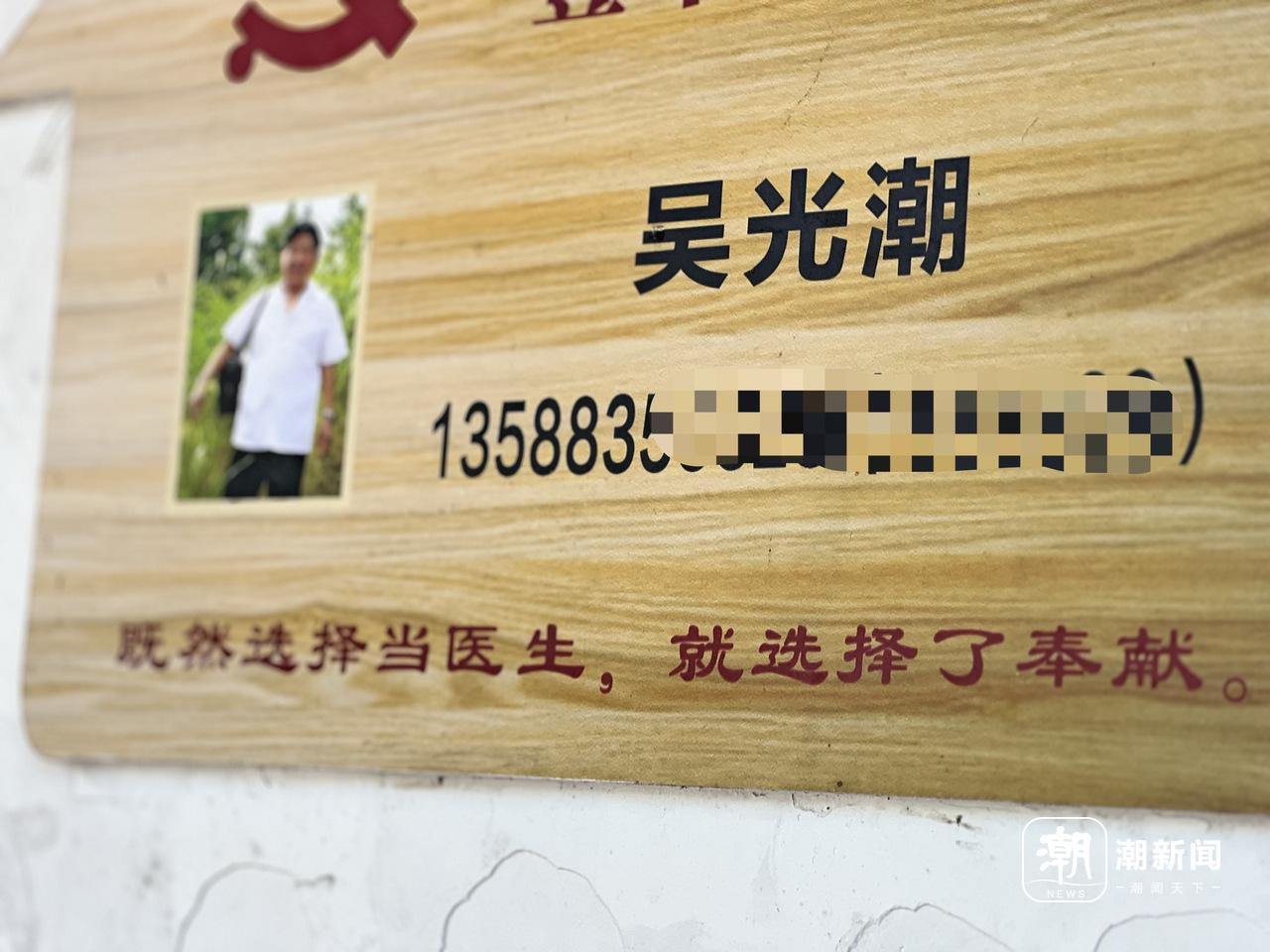 梅塘村卫生室的诊室门口,挂着吴光潮的介绍牌,上面有他说过的一句话——既然选择当医生,就选择了奉献。