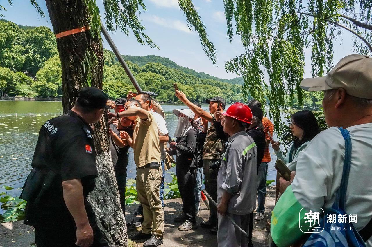 2025年5月14日上午11点30分许,在杭州市西湖景区西泠桥旁的一棵柳树旁,人们正在救助长时间被困树洞,无法完成跳巢的小鸳鸯。原来,这个柳树洞有2米左右深度,破壳的小鸳鸯要成功跳巢就要爬上2米高的树洞,这几乎是不可能完成的任务,树洞外的鸳鸯妈妈飞进飞出,急得团团转,最后在树洞外不停鸣叫呼唤……