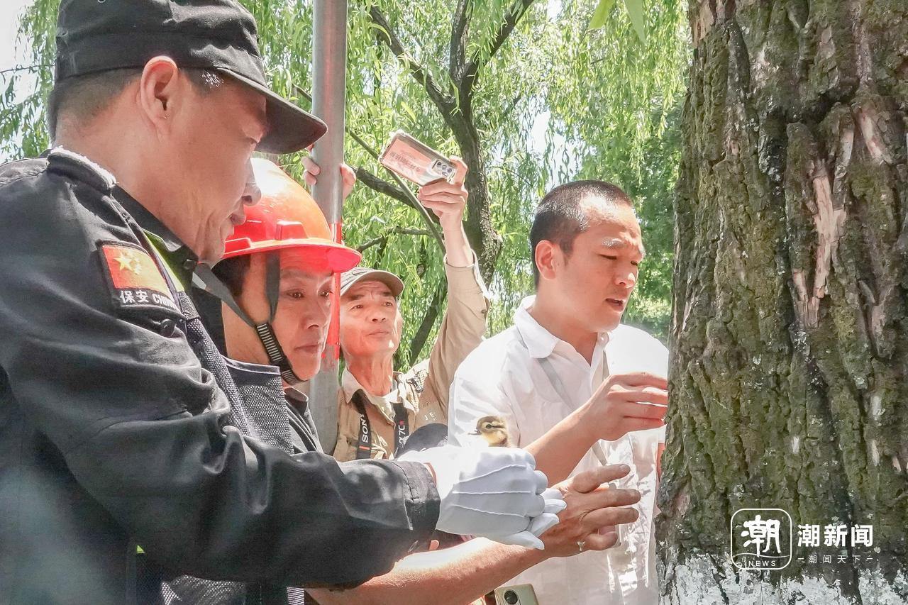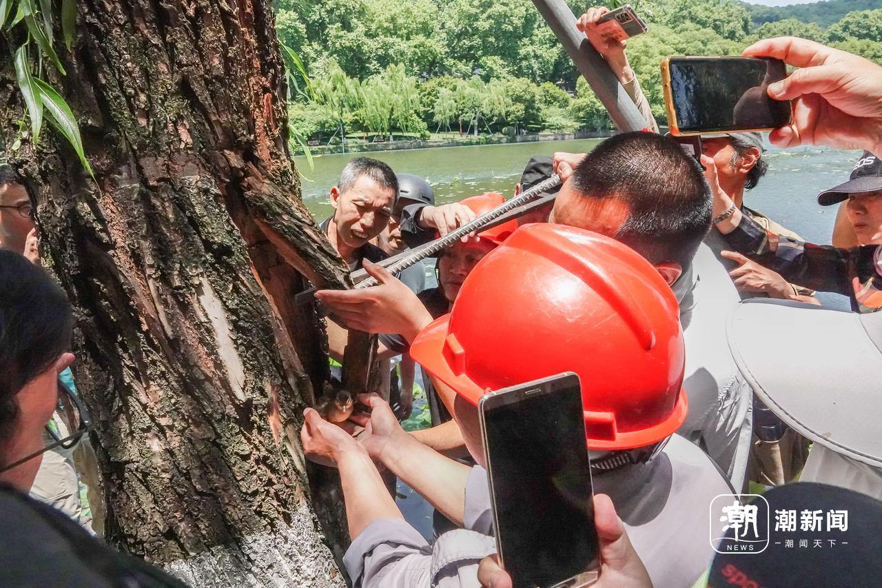 接到求助消息,西湖景区岳庙管理处工作人员赶到现场,听声判断出小鸳鸯被困的位置,通过给这棵柳树原有裂缝处开了一个小口子,打开了生命“通道”,大约5分钟后,11只小鸳鸯成功出巢,随后与母鸳鸯在西湖团聚。