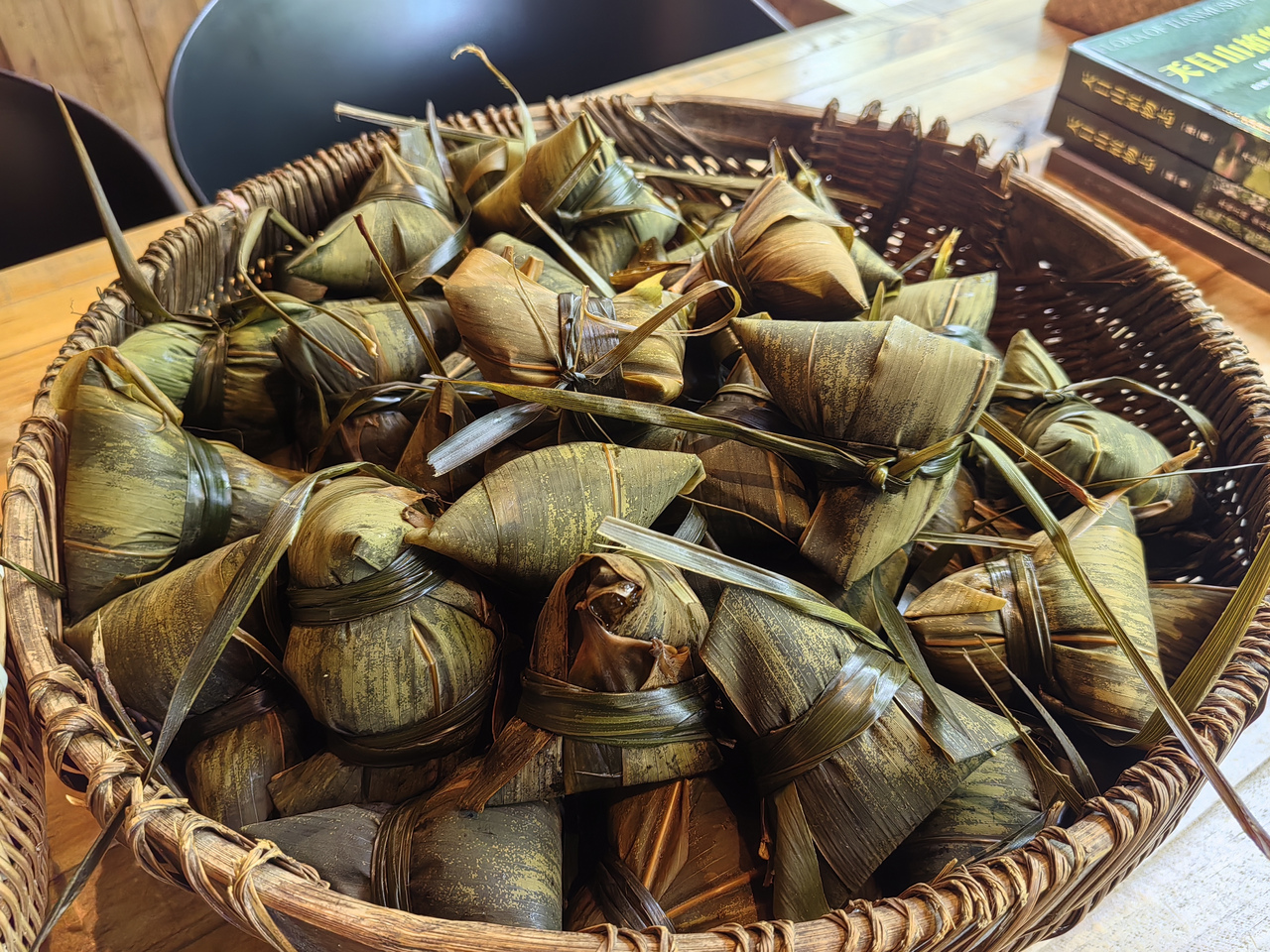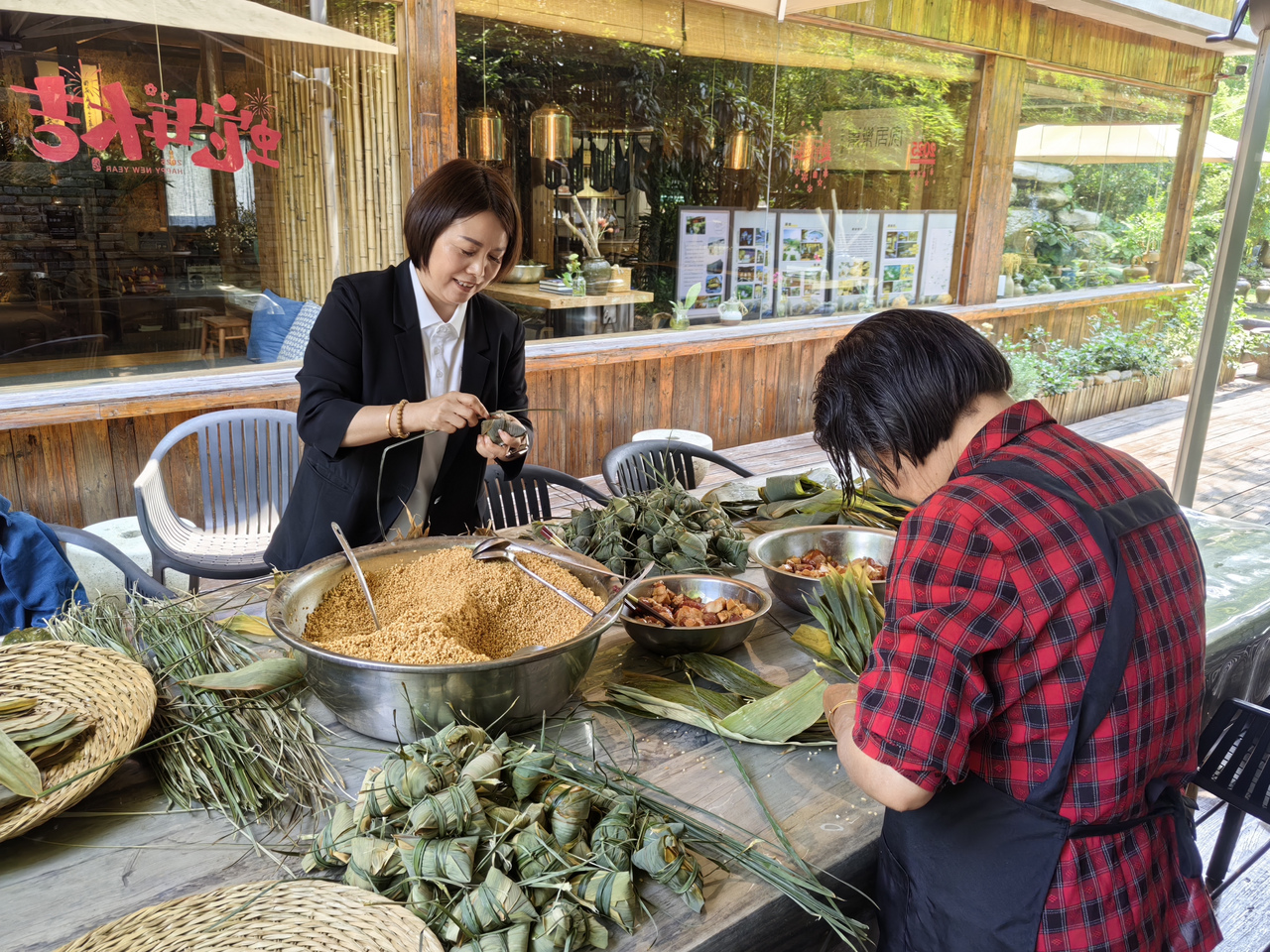 5月25日中午,在月亮工坊民宿小院,门楣上新插的艾草散发着特有的清香。院子里,民宿负责人张慧云和员工们一起包着粽子。翠绿的粽叶、晶莹的糯米、土猪肉铺满桌面。巧手翻飞间,一个个棱角分明的粽子渐渐成型,欢声笑语伴着粽叶的窸窣声,充满了节日的暖意。