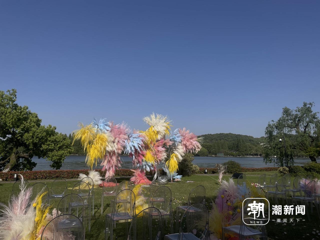 小两口举办的西式婚礼只摆了八桌,与西湖边的风景相伴,更像是一场私人聚会。