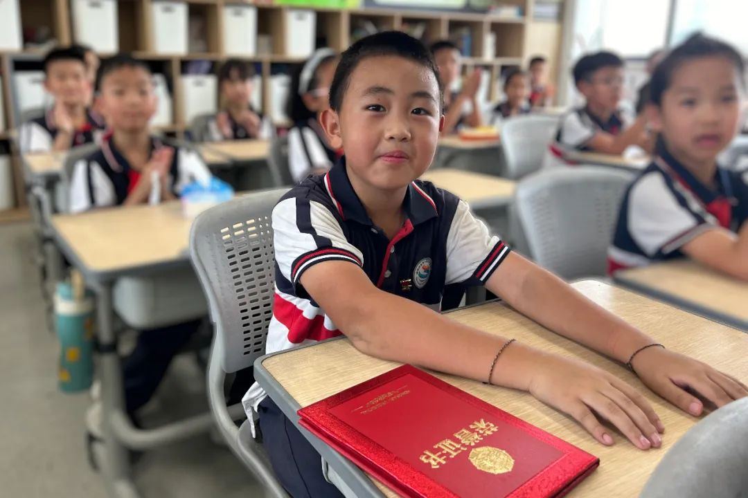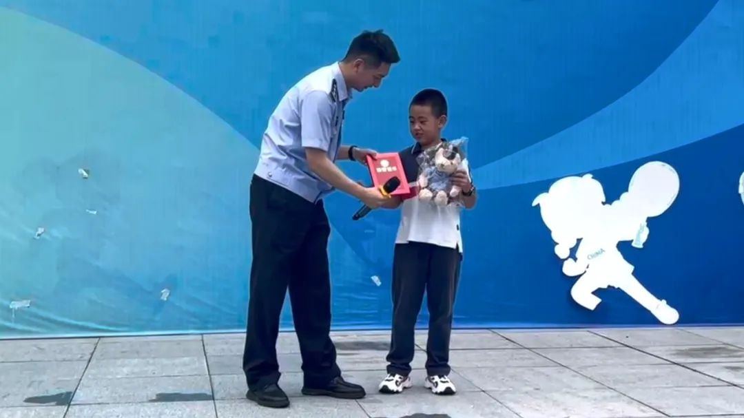 前两天,梧田派出所民警带着奖状和礼物——一只小熊玩偶来到了王品鉴的学校,表扬他的勇敢。