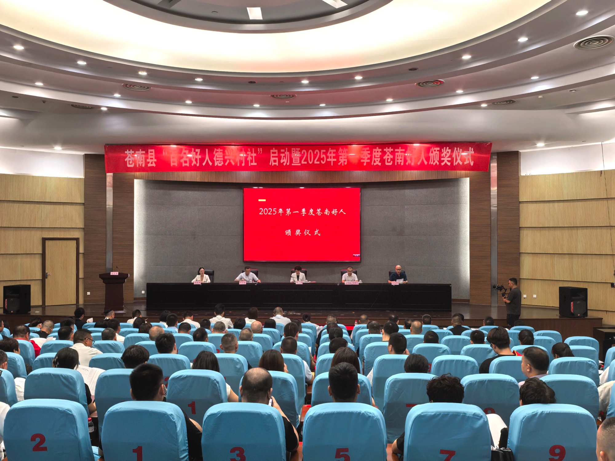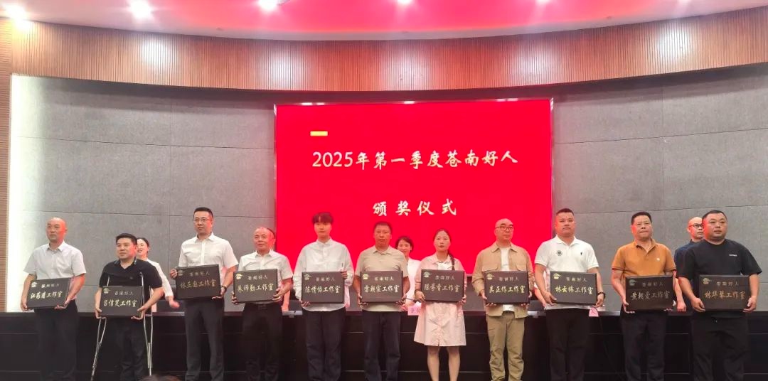 在苍南县“百名好人德兴村社”启动暨2025年第一季度苍南好人颁奖仪式上,好人与村社签订了合作协议书,入选2025年第一季度“苍南好人榜”的19位“苍南好人”上台接受表彰,苍南县第三批11个好人工作室被授牌。